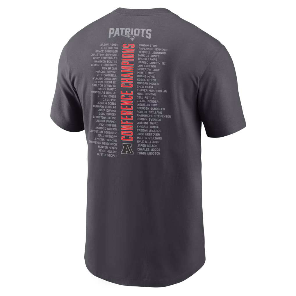 Men’s New England Patriots Nike Anthracite 2025 AFC Champions Roster T-Shirt