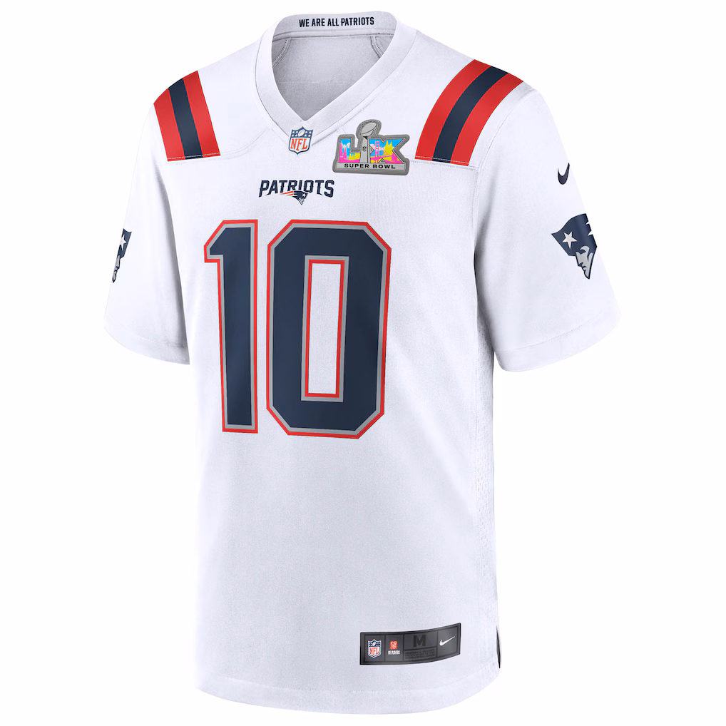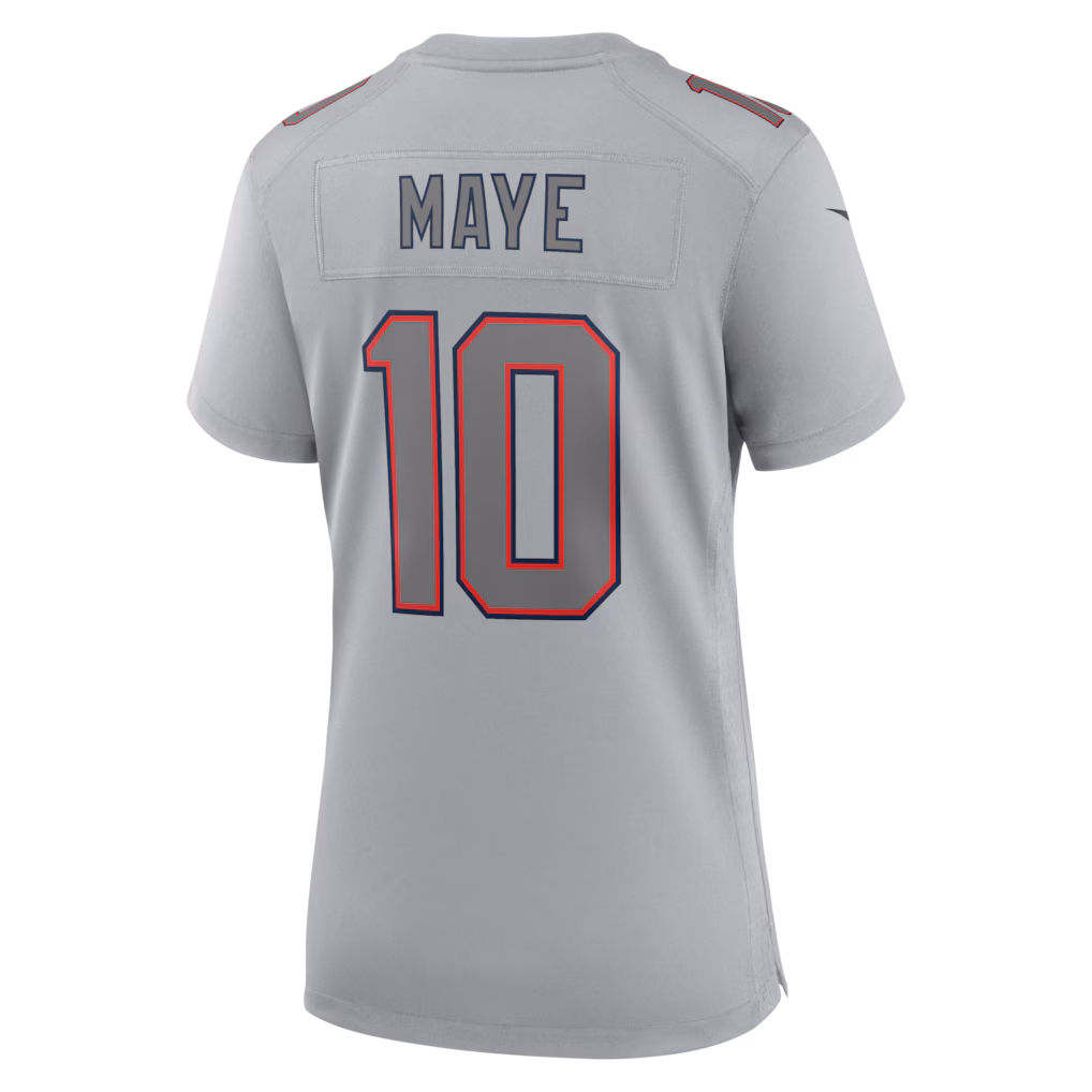 Women’s New England Patriots Drake Maye Nike Silver Super Bowl LX Patch Atmosphere Fashion Game Jersey
