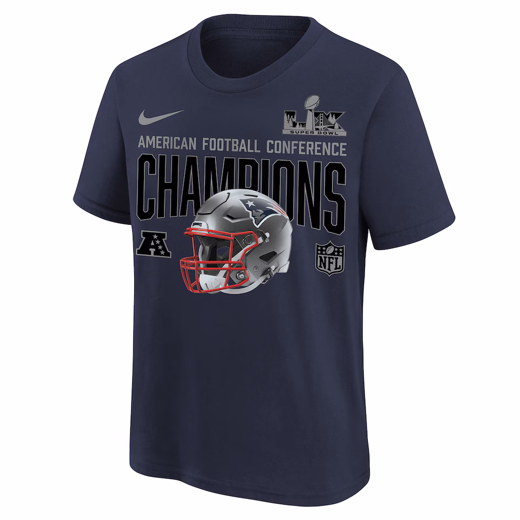 Youth New England Patriots Nike Navy 2025 AFC Champions Glory Shield Helmet T-Shirt